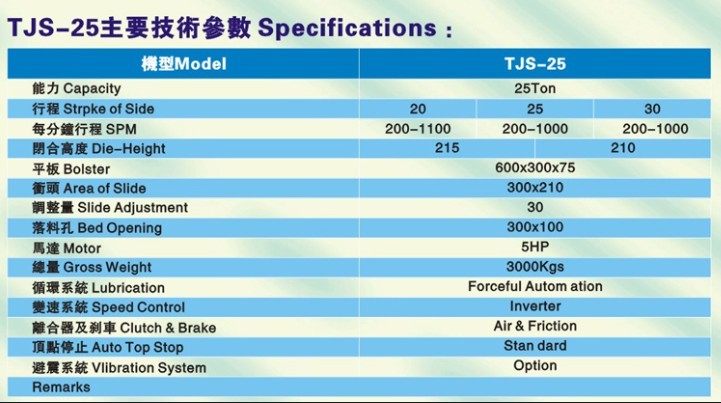 產品編號tjs―25 產品名稱高速三圓導柱精密沖床 產品規格見上圖產品說明 機械特性1.采用三圓導柱結構,使動力磨擦減少,24小時運作熱度位降至最小,而精度達到保護延長橫具壽命。 2.采用多功能的觸控式螢幕,中,英二種文字顯示,不需熟練技術,一般員工皆可操作,功能齊全。沖床的角度轉速及故障等訊息可全部在顯示屏上顯示,實現安全無傷害作業. 3.鑄鐵以抗拉強度高的合金鑄鐵鑄成,并經國家檢驗部門質量檢測,具有良好之吸震性能,在高速動壓及高速進給的情況下,機身沉穩,震動小,確保機室的長期精度 4.模高調整采用手動式,操作方便. 5.可選配反側負載動態平衡,以平衡曲軸,滑塊在高速運轉時產生的震動,控制下死點精度。 6.所有軸承采用良好的日本軸承,精度穩定,確保機臺的良好性能;